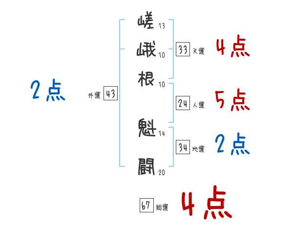 人運![]() | 嵯峨根魁闘さんの人運は24画の5つ星!家庭運が良く順調な人生。金運にも恵まれる。 性格や才能などを表す2番目に重要な運勢です。人間関係や協調性、社会的な成功に影響します。主に20歳から50歳ぐらいまでの中年期の運勢を表します。 |