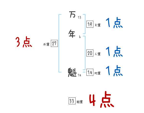 天運![]() | 万年魁さんの天運は19画の1つ星!優れた才能を持ちますが、協調性が足りないことも。周りの人と協力する事を意識しましょう。 家系が持つ宿命的な運勢を表します。祖先から受け継いだ苗字ですので自分の力が及びません。家柄を象徴します。 |