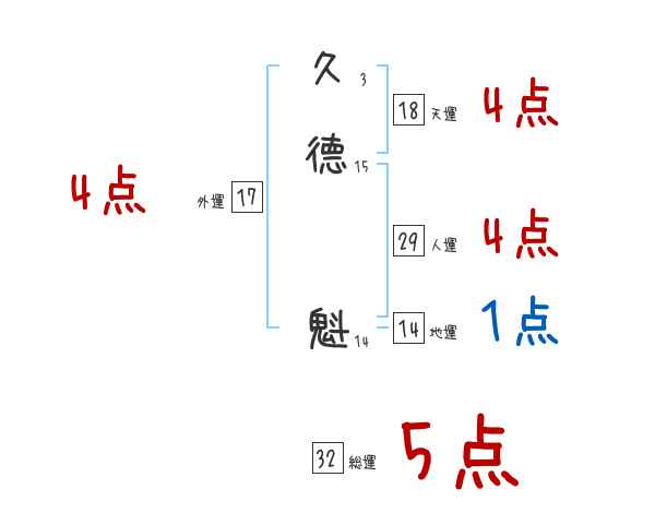総運![]() | 久德魁さんの総運は32画の5つ星!柔軟性があり成功する。チャンスが多く金運が良い。 あなたの人生を表す1番重要な運勢です。生涯を通じて影響する総合運となり、主に50歳以降の晩年期に影響を及ぼします。 |