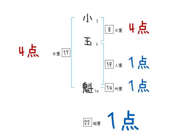 天運![]() | 小玉魁さんの天運は8画の4つ星!勤勉家。根気強く努力し成功する。忍耐力がある。 家系が持つ宿命的な運勢を表します。祖先から受け継いだ苗字ですので自分の力が及びません。家柄を象徴します。 |