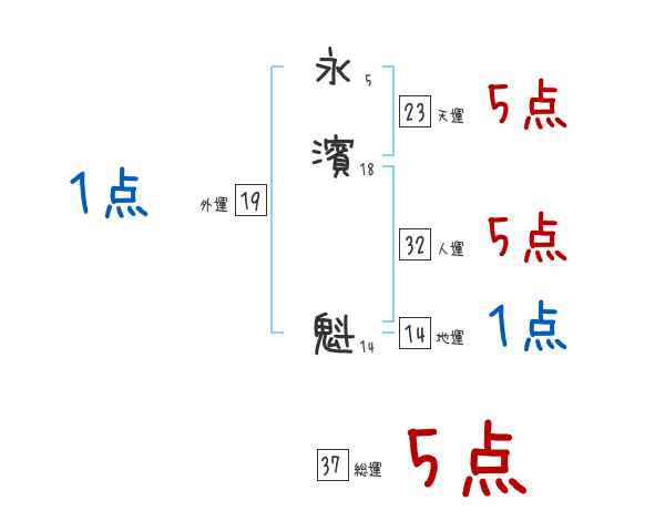 人運![]() | 永濱魁さんの人運は32画の5つ星!柔軟性があり成功する。チャンスが多く金運が良い。 性格や才能などを表す2番目に重要な運勢です。人間関係や協調性、社会的な成功に影響します。主に20歳から50歳ぐらいまでの中年期の運勢を表します。 |