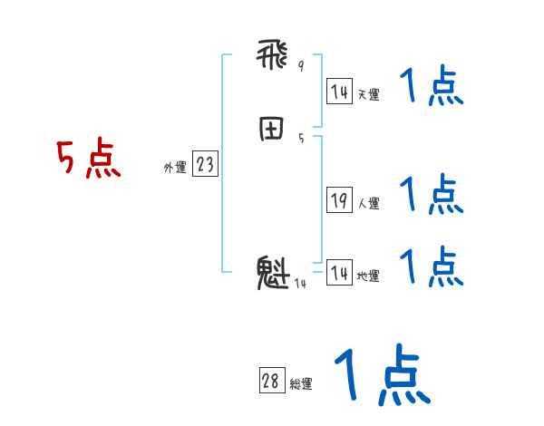 外運![]() | 飛田魁さんの外運は23画の5つ星!想像力に優れ活力がある。一代で成功し名誉を手に入れる。 生活面を象徴する運勢です。外部から受ける影響力を表し、結婚運、家庭運や職場、環境への順応性を表します。 |