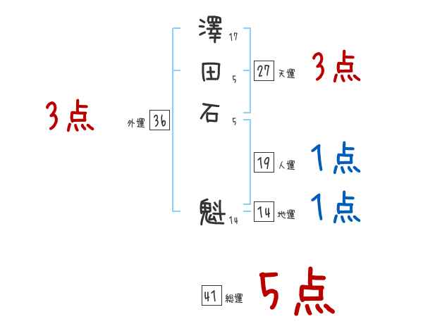 外運![]() | 澤田石魁さんの外運は36画の3つ星!先見性が豊かです。多少神経質で苦労することも。 生活面を象徴する運勢です。外部から受ける影響力を表し、結婚運、家庭運や職場、環境への順応性を表します。 |