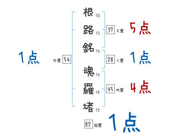 外運![]() | 根路銘魂羅堵さんの外運は54画の1つ星!トラブルが多いかも。周りをよく見て協調して過ごしましょう。 生活面を象徴する運勢です。外部から受ける影響力を表し、結婚運、家庭運や職場、環境への順応性を表します。 |