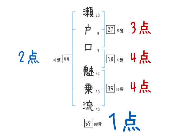 外運![]() | 瀬戸口魅乗流さんの外運は44画の2つ星!誠実で慎重な性格。物事を考えすぎないように注意しましょう。 生活面を象徴する運勢です。外部から受ける影響力を表し、結婚運、家庭運や職場、環境への順応性を表します。 |