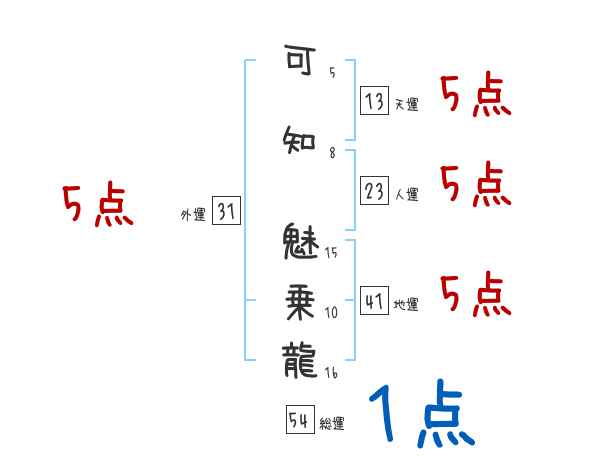 人運![]() | 可知魅乗龍さんの人運は23画の5つ星!想像力に優れ活力がある。一代で成功し名誉を手に入れる。 性格や才能などを表す2番目に重要な運勢です。人間関係や協調性、社会的な成功に影響します。主に20歳から50歳ぐらいまでの中年期の運勢を表します。 |