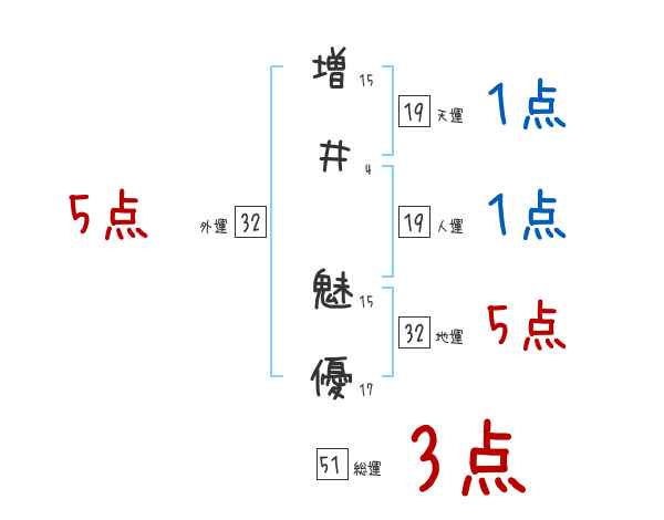 外運![]() | 増井魅優さんの外運は32画の5つ星!柔軟性があり成功する。チャンスが多く金運が良い。 生活面を象徴する運勢です。外部から受ける影響力を表し、結婚運、家庭運や職場、環境への順応性を表します。 |