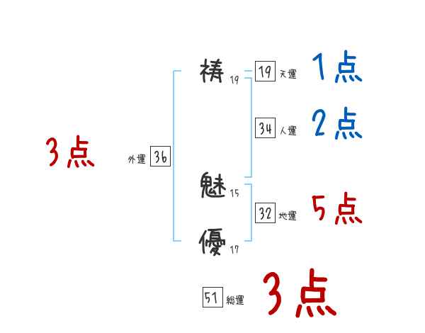 外運![]() | 祷魅優さんの外運は36画の3つ星!先見性が豊かです。多少神経質で苦労することも。 生活面を象徴する運勢です。外部から受ける影響力を表し、結婚運、家庭運や職場、環境への順応性を表します。 |