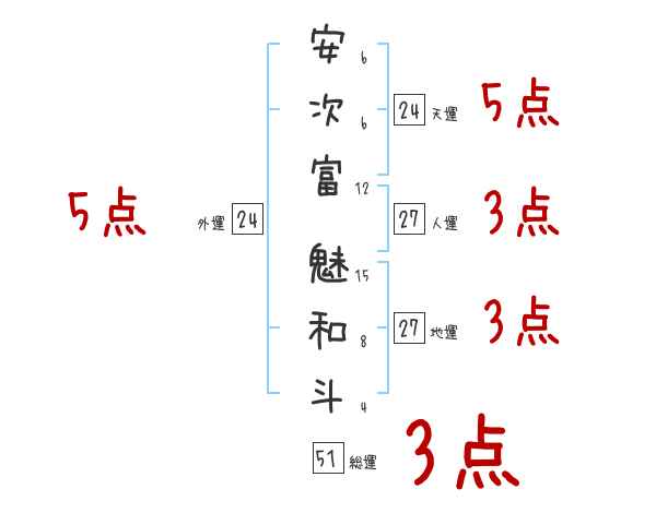 外運![]() | 安次富魅和斗さんの外運は24画の5つ星!家庭運が良く順調な人生。金運にも恵まれる。 生活面を象徴する運勢です。外部から受ける影響力を表し、結婚運、家庭運や職場、環境への順応性を表します。 |