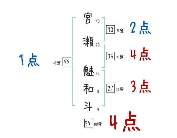 外運![]() | 宮瀬魅和斗さんの外運は22画の1つ星!努力することが苦手ないっぽう手先が器用。芸術性にも優れる。 生活面を象徴する運勢です。外部から受ける影響力を表し、結婚運、家庭運や職場、環境への順応性を表します。 |