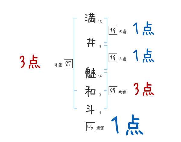 人運![]() | 満井魅和斗さんの人運は19画の1つ星!優れた才能を持ちますが、協調性が足りないことも。周りの人と協力する事を意識しましょう。 性格や才能などを表す2番目に重要な運勢です。人間関係や協調性、社会的な成功に影響します。主に20歳から50歳ぐらいまでの中年期の運勢を表します。 |