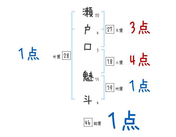 外運![]() | 瀬戸口魅斗さんの外運は28画の1つ星!家庭環境に注意。スポーツで活躍できる能力があるかも。 生活面を象徴する運勢です。外部から受ける影響力を表し、結婚運、家庭運や職場、環境への順応性を表します。 |