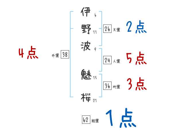 人運![]() | 伊野波魅桜さんの人運は24画の5つ星!家庭運が良く順調な人生。金運にも恵まれる。 性格や才能などを表す2番目に重要な運勢です。人間関係や協調性、社会的な成功に影響します。主に20歳から50歳ぐらいまでの中年期の運勢を表します。 |
