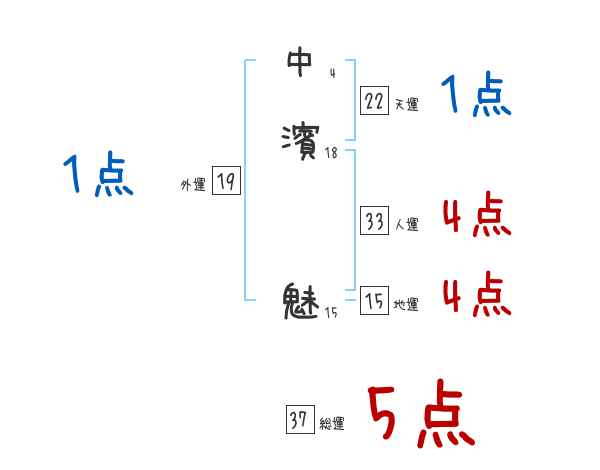 天運![]() | 中濱魅さんの天運は22画の1つ星!努力することが苦手ないっぽう手先が器用。芸術性にも優れる。 家系が持つ宿命的な運勢を表します。祖先から受け継いだ苗字ですので自分の力が及びません。家柄を象徴します。 |