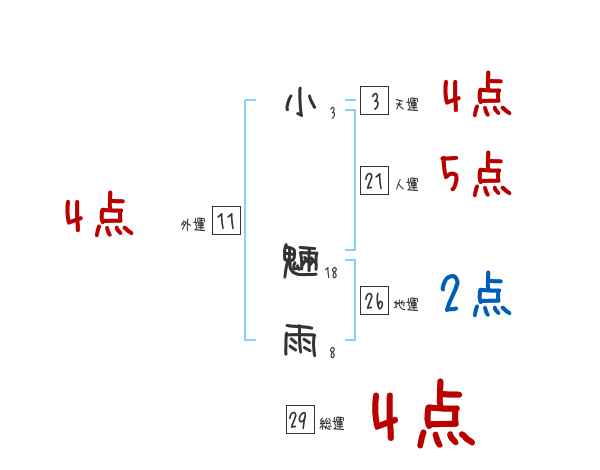 天運![]() | 小魎雨さんの天運は3画の4つ星!活動的で才能に恵まれ、多くの信頼を得る。希望に満ち成長する。 家系が持つ宿命的な運勢を表します。祖先から受け継いだ苗字ですので自分の力が及びません。家柄を象徴します。 |