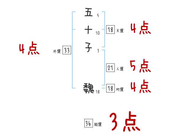 天運![]() | 五十子魏さんの天運は18画の4つ星!情熱的で剛気。忍耐力があり信頼される。 家系が持つ宿命的な運勢を表します。祖先から受け継いだ苗字ですので自分の力が及びません。家柄を象徴します。 |