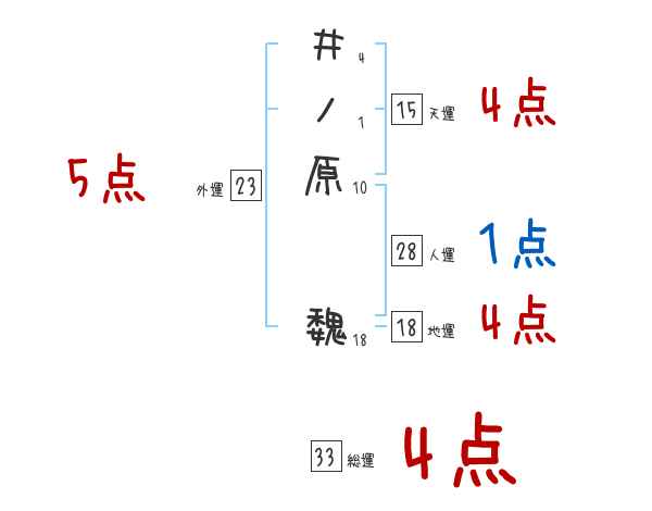 総運![]() | 井ノ原魏さんの総運は33画の4つ星!権力志向でプライドが高い。勇気があり運を切り開き成功する。 あなたの人生を表す1番重要な運勢です。生涯を通じて影響する総合運となり、主に50歳以降の晩年期に影響を及ぼします。 |