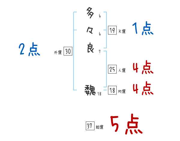 天運![]() | 多々良魏さんの天運は19画の1つ星!優れた才能を持ちますが、協調性が足りないことも。周りの人と協力する事を意識しましょう。 家系が持つ宿命的な運勢を表します。祖先から受け継いだ苗字ですので自分の力が及びません。家柄を象徴します。 |