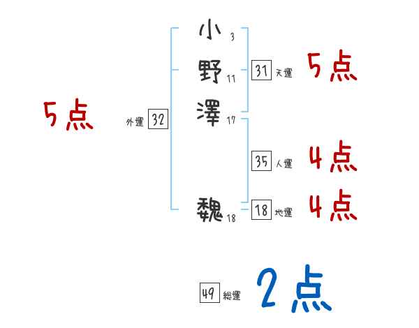 小野澤魏さんの画数の鑑定結果