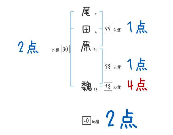 天運![]() | 尾田原魏さんの天運は22画の1つ星!努力することが苦手ないっぽう手先が器用。芸術性にも優れる。 家系が持つ宿命的な運勢を表します。祖先から受け継いだ苗字ですので自分の力が及びません。家柄を象徴します。 |