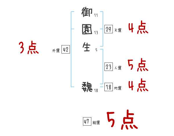 人運![]() | 御園生魏さんの人運は23画の5つ星!想像力に優れ活力がある。一代で成功し名誉を手に入れる。 性格や才能などを表す2番目に重要な運勢です。人間関係や協調性、社会的な成功に影響します。主に20歳から50歳ぐらいまでの中年期の運勢を表します。 |