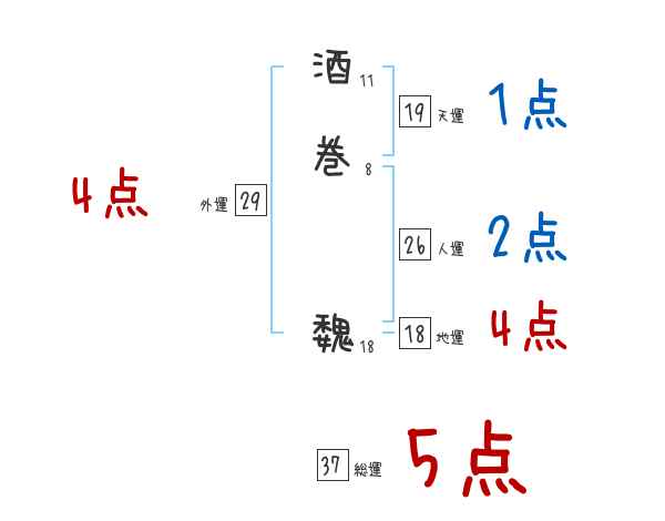 外運![]() | 酒巻魏さんの外運は29画の4つ星!完全主義で才能がある。厳格な心の持ち主。 生活面を象徴する運勢です。外部から受ける影響力を表し、結婚運、家庭運や職場、環境への順応性を表します。 |