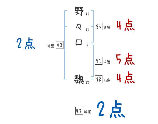 外運![]() | 野々口魏さんの外運は40画の2つ星!自信過剰で物事に固執するためトラブルに注意。 生活面を象徴する運勢です。外部から受ける影響力を表し、結婚運、家庭運や職場、環境への順応性を表します。 |
