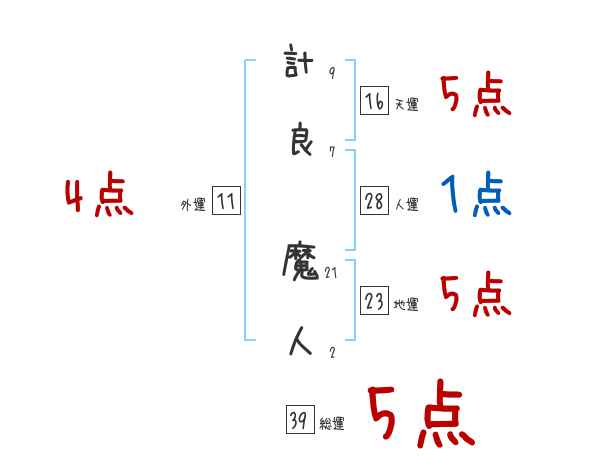 天運![]() | 計良魔人さんの天運は16画の5つ星!人望が厚く大きく発展する。逆転成功が見える。 家系が持つ宿命的な運勢を表します。祖先から受け継いだ苗字ですので自分の力が及びません。家柄を象徴します。 |