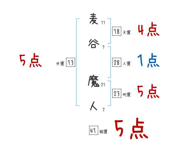 天運![]() | 麦谷魔人さんの天運は18画の4つ星!情熱的で剛気。忍耐力があり信頼される。 家系が持つ宿命的な運勢を表します。祖先から受け継いだ苗字ですので自分の力が及びません。家柄を象徴します。 |