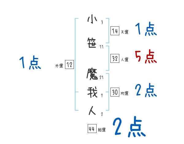 人運![]() | 小笹魔我人さんの人運は32画の5つ星!柔軟性があり成功する。チャンスが多く金運が良い。 性格や才能などを表す2番目に重要な運勢です。人間関係や協調性、社会的な成功に影響します。主に20歳から50歳ぐらいまでの中年期の運勢を表します。 |