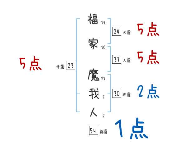 天運![]() | 福家魔我人さんの天運は24画の5つ星!家庭運が良く順調な人生。金運にも恵まれる。 家系が持つ宿命的な運勢を表します。祖先から受け継いだ苗字ですので自分の力が及びません。家柄を象徴します。 |