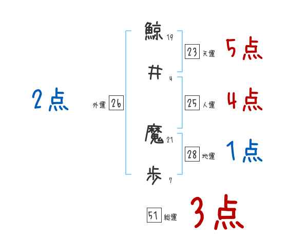 天運![]() | 鯨井魔歩さんの天運は23画の5つ星!想像力に優れ活力がある。一代で成功し名誉を手に入れる。 家系が持つ宿命的な運勢を表します。祖先から受け継いだ苗字ですので自分の力が及びません。家柄を象徴します。 |