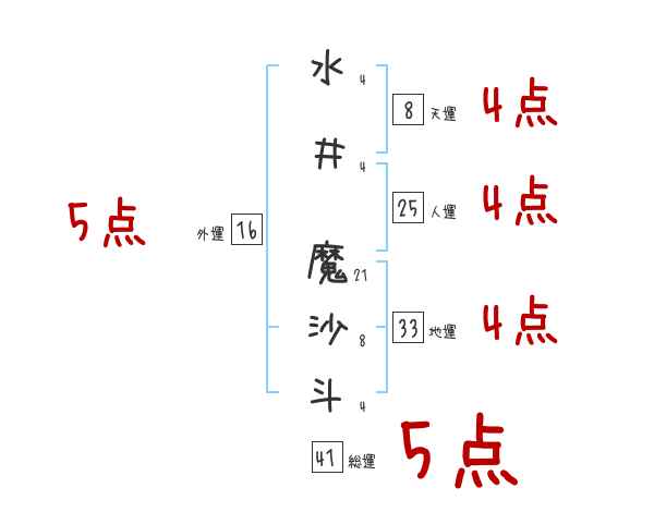 天運![]() | 水井魔沙斗さんの天運は8画の4つ星!勤勉家。根気強く努力し成功する。忍耐力がある。 家系が持つ宿命的な運勢を表します。祖先から受け継いだ苗字ですので自分の力が及びません。家柄を象徴します。 |