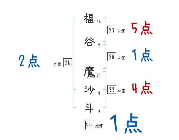 天運![]() | 福谷魔沙斗さんの天運は21画の5つ星!統率力がある。独立し成功する。名誉を手に入れる。 家系が持つ宿命的な運勢を表します。祖先から受け継いだ苗字ですので自分の力が及びません。家柄を象徴します。 |