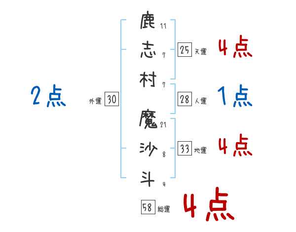 天運![]() | 鹿志村魔沙斗さんの天運は25画の4つ星!個性があり才能があふれる。強運の持ち主で発展する。 家系が持つ宿命的な運勢を表します。祖先から受け継いだ苗字ですので自分の力が及びません。家柄を象徴します。 |