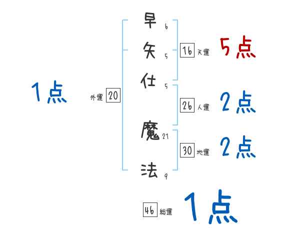 天運![]() | 早矢仕魔法さんの天運は16画の5つ星!人望が厚く大きく発展する。逆転成功が見える。 家系が持つ宿命的な運勢を表します。祖先から受け継いだ苗字ですので自分の力が及びません。家柄を象徴します。 |