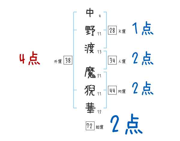 総運![]() | 中野渡魔猊華さんの総運は72画の2つ星!災難が多く不安定な生活にならないように注意。明暗のある人生かも。 あなたの人生を表す1番重要な運勢です。生涯を通じて影響する総合運となり、主に50歳以降の晩年期に影響を及ぼします。 |