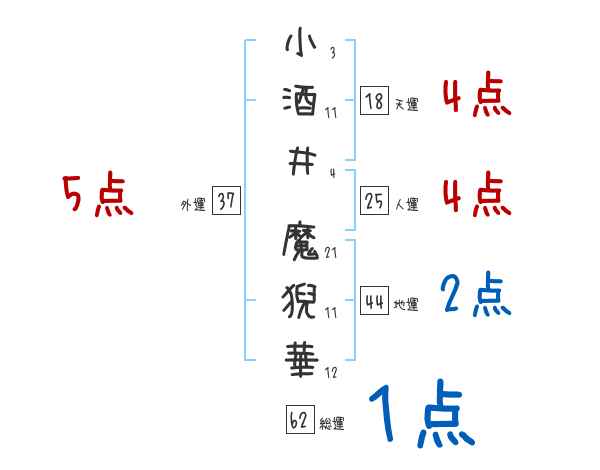 人運![]() | 小酒井魔猊華さんの人運は25画の4つ星!個性があり才能があふれる。強運の持ち主で発展する。 性格や才能などを表す2番目に重要な運勢です。人間関係や協調性、社会的な成功に影響します。主に20歳から50歳ぐらいまでの中年期の運勢を表します。 |