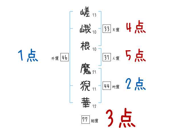 人運![]() | 嵯峨根魔猊華さんの人運は31画の5つ星!社交性があり判断力に優れる。順風満帆な人生で円満な生活。 性格や才能などを表す2番目に重要な運勢です。人間関係や協調性、社会的な成功に影響します。主に20歳から50歳ぐらいまでの中年期の運勢を表します。 |