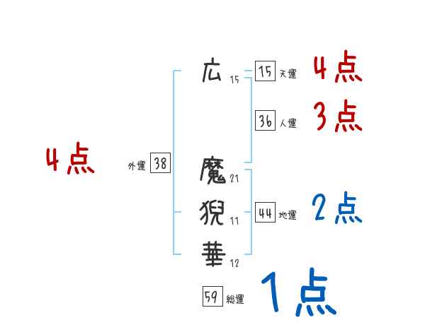 地運![]() | 広魔猊華さんの地運は44画の2つ星!誠実で慎重な性格。物事を考えすぎないように注意しましょう。 個性を表す基礎的な運勢です。性格形成や対人関係、行動力など家庭環境に影響されます。主に誕生してから20歳くらいまでの若年期の運勢を表します。 |