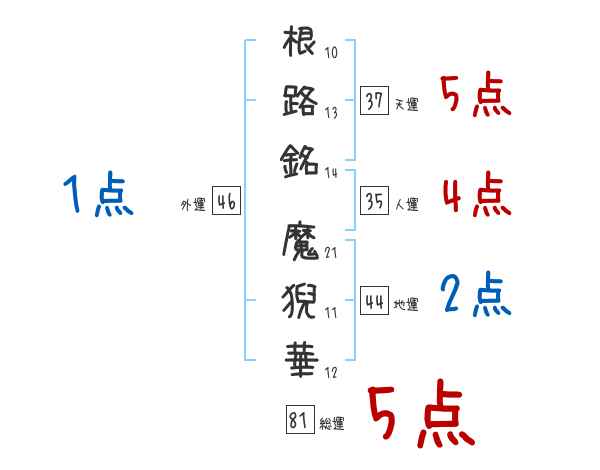 総運![]() | 根路銘魔猊華さんの総運は81画の5つ星!行動力、指導力があり出世し繁栄する。幸運に恵まれる。 あなたの人生を表す1番重要な運勢です。生涯を通じて影響する総合運となり、主に50歳以降の晩年期に影響を及ぼします。 |