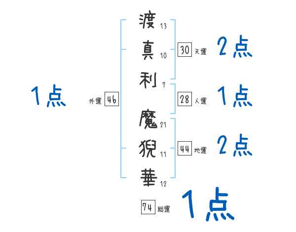 天運![]() | 渡真利魔猊華さんの天運は30画の2つ星!浮き沈みの激しさに注意しましょう。 家系が持つ宿命的な運勢を表します。祖先から受け継いだ苗字ですので自分の力が及びません。家柄を象徴します。 |