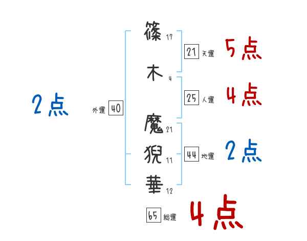 天運![]() | 篠木魔猊華さんの天運は21画の5つ星!統率力がある。独立し成功する。名誉を手に入れる。 家系が持つ宿命的な運勢を表します。祖先から受け継いだ苗字ですので自分の力が及びません。家柄を象徴します。 |