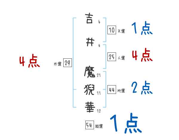 天運![]() | 吉井魔猊華さんの天運は10画の1つ星!不安を感じやすい傾向。ストレスを抱えないように注意しましょう。 家系が持つ宿命的な運勢を表します。祖先から受け継いだ苗字ですので自分の力が及びません。家柄を象徴します。 |