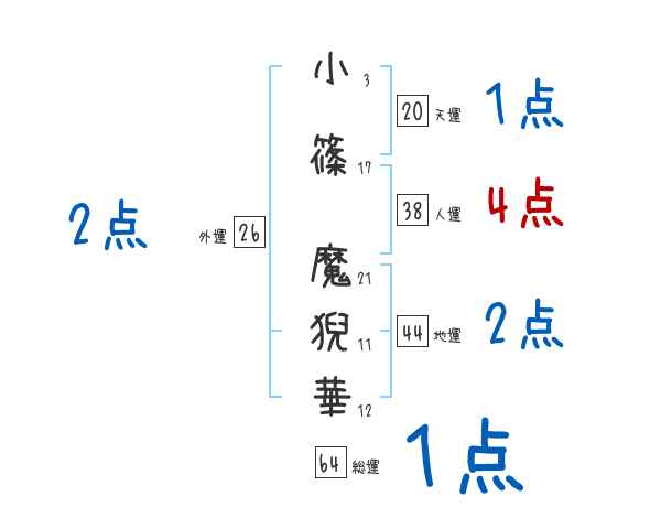 外運![]() | 小篠魔猊華さんの外運は26画の2つ星!波瀾万丈かも。信頼できる人を大事にしましょう。 生活面を象徴する運勢です。外部から受ける影響力を表し、結婚運、家庭運や職場、環境への順応性を表します。 |