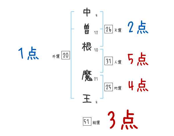 天運![]() | 中曽根魔王さんの天運は26画の2つ星!波瀾万丈かも。信頼できる人を大事にしましょう。 家系が持つ宿命的な運勢を表します。祖先から受け継いだ苗字ですので自分の力が及びません。家柄を象徴します。 |