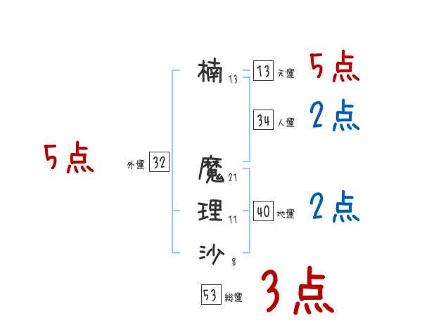 外運![]() | 楠魔理沙さんの外運は32画の5つ星!柔軟性があり成功する。チャンスが多く金運が良い。 生活面を象徴する運勢です。外部から受ける影響力を表し、結婚運、家庭運や職場、環境への順応性を表します。 |
