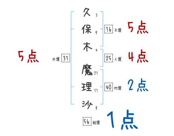 天運![]() | 久保木魔理沙さんの天運は16画の5つ星!人望が厚く大きく発展する。逆転成功が見える。 家系が持つ宿命的な運勢を表します。祖先から受け継いだ苗字ですので自分の力が及びません。家柄を象徴します。 |