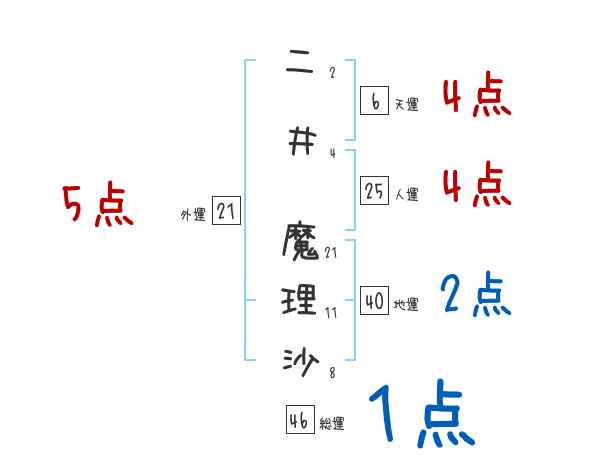 外運![]() | 二井魔理沙さんの外運は21画の5つ星!統率力がある。独立し成功する。名誉を手に入れる。 生活面を象徴する運勢です。外部から受ける影響力を表し、結婚運、家庭運や職場、環境への順応性を表します。 |