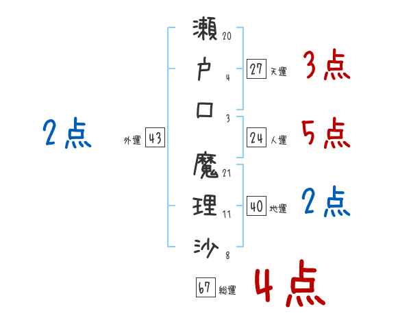 天運![]() | 瀬戸口魔理沙さんの天運は27画の3つ星!頭脳明晰だが強情で摩擦が多い傾向。孤立に注意。 家系が持つ宿命的な運勢を表します。祖先から受け継いだ苗字ですので自分の力が及びません。家柄を象徴します。 |